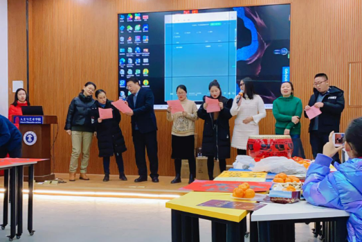 教职工新年联欢会中间,还进行了互动与抽奖环节,多位老师分别获得特等奖、一等奖、二等奖和三等奖;部分奖品赞助单位美的天誉公司的负责人也来到现场,表达了新年祝福。此外,啪啪啦