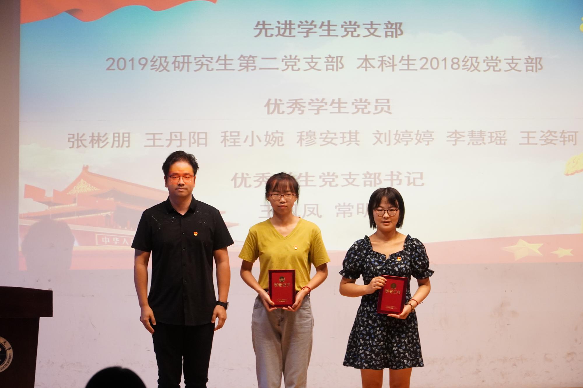 会议伊始,全体起立并奏唱《国际歌》。随后,李广文副院长宣读表彰文件及获奖者名单。党委书记方跃平、副院长汤道路、副院长刘振分别为获得“先进学生党支部”荣誉称号的2019级研究生第二党支部、2018级本科生党支部和张彬朋等七名“优秀学生党员”以及王凤凤、常明慧两位“优秀学生党支部书记”颁奖。颁奖结束后,法学系主任冯浩老师进行入党誓词领誓,新党员庄严地进行入党宣誓,老党员重温入党誓词。