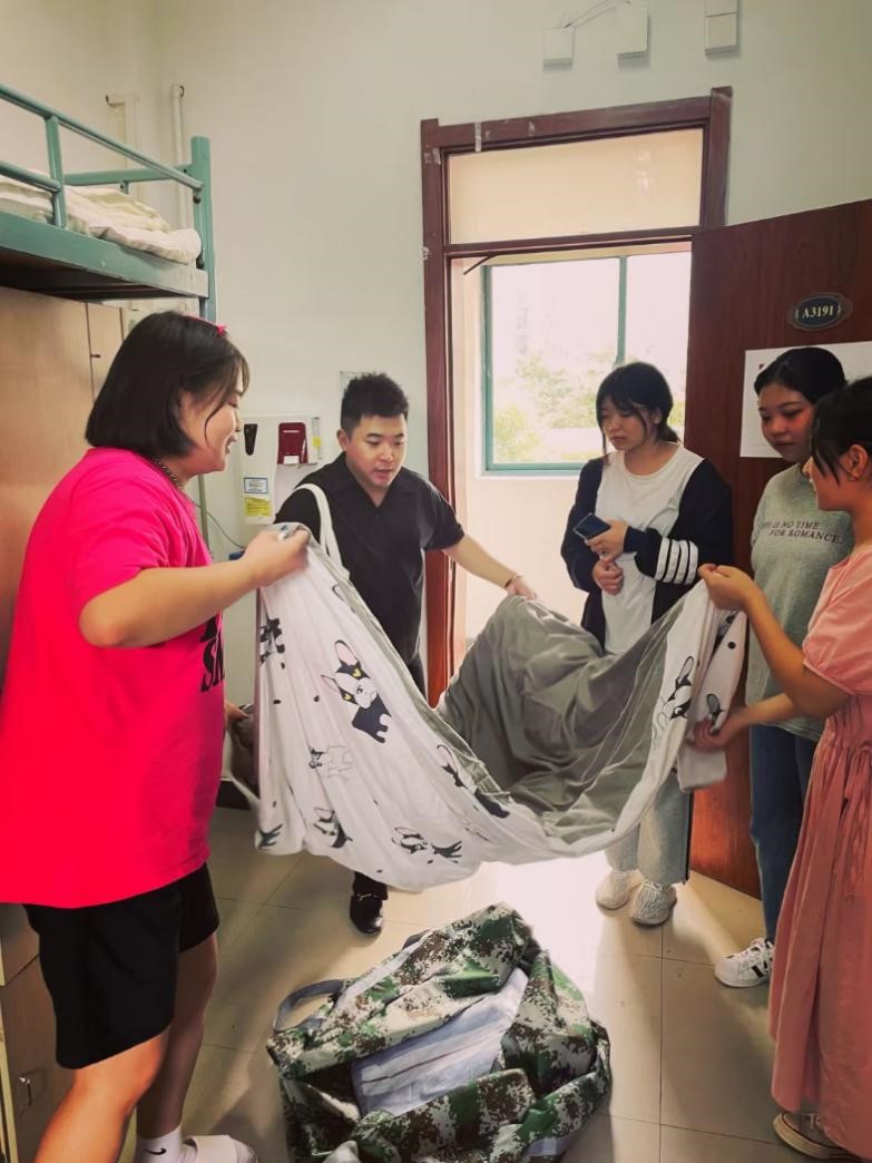 图七:班主任董德老师为新生整理生活用品进行示范