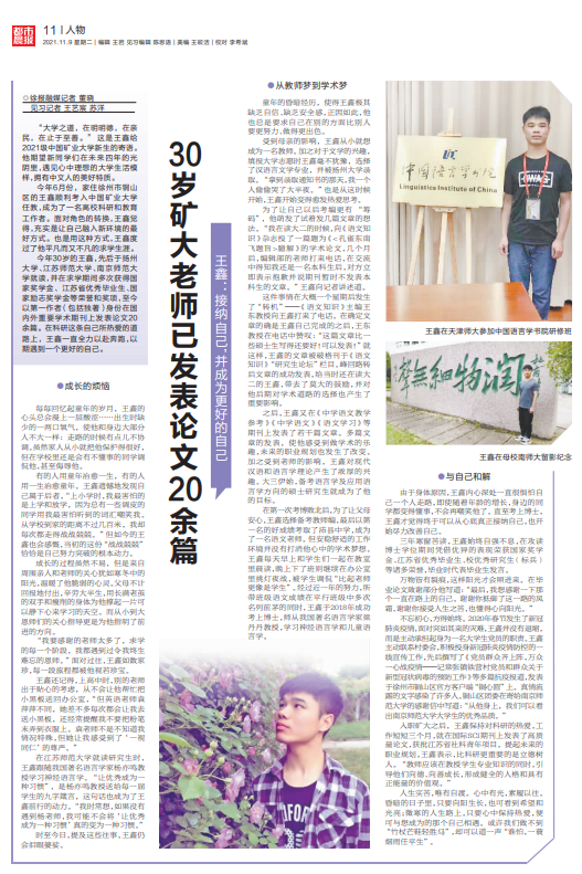 11月9日,《都市晨报》在“人物”专版,以“30岁矿大老师已发表论文20余篇,王鑫:接纳自己,并成为更好的自己”为题,整版介绍中文系王鑫博士事迹。