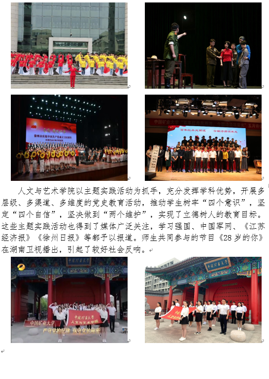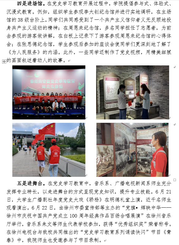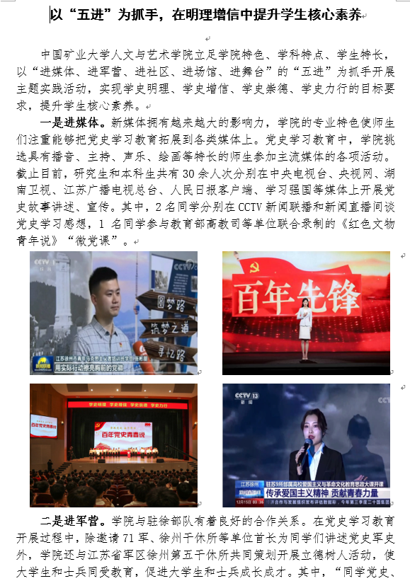 特色、学科特点、学生特长,以“进媒体、进军营、进社区、进场馆、进舞台”的“五进”为抓手开展主题实践活动,实现学史明理、学史增信、学史崇德、学史力行的目标要求,提升学生核心素养,取得了显著效果。