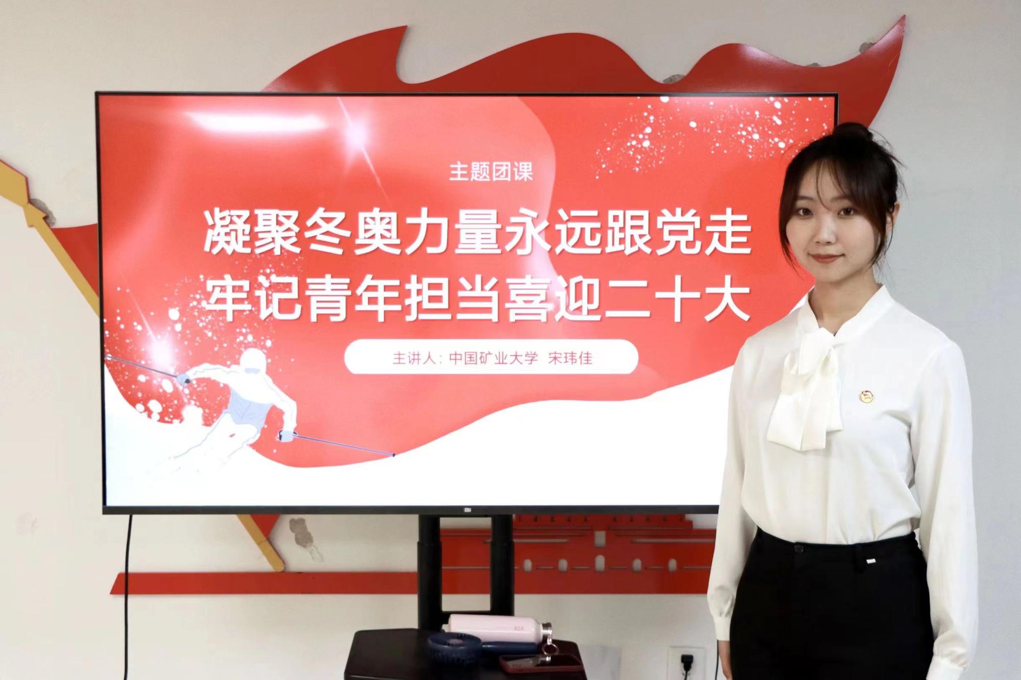 宋玮佳同学在“主题团课”展示中,围绕“凝聚冬奥力量永远跟党走,牢记青年担当喜迎二十大”的主题,从“敢于有梦”、“勤于追梦”、“勇于圆梦”三个角度切入,介绍了北京冬奥会中的历史成就、时代考验和青年力量,深入阐释了“新时代是追梦者的时代,更是新时代青年人成就梦想的时代”,号召青年团员们永远跟党走,奋进新征程。在“主题团日活动”展示中,她围绕“忆建团百年风华,请长缨不负使命”的主题,以建团100周年为契机,帮助广大团员们深刻理解“共青团是党的助手和后备军”的含义,号召青年团员们勇担时代使命、不负历史重任。