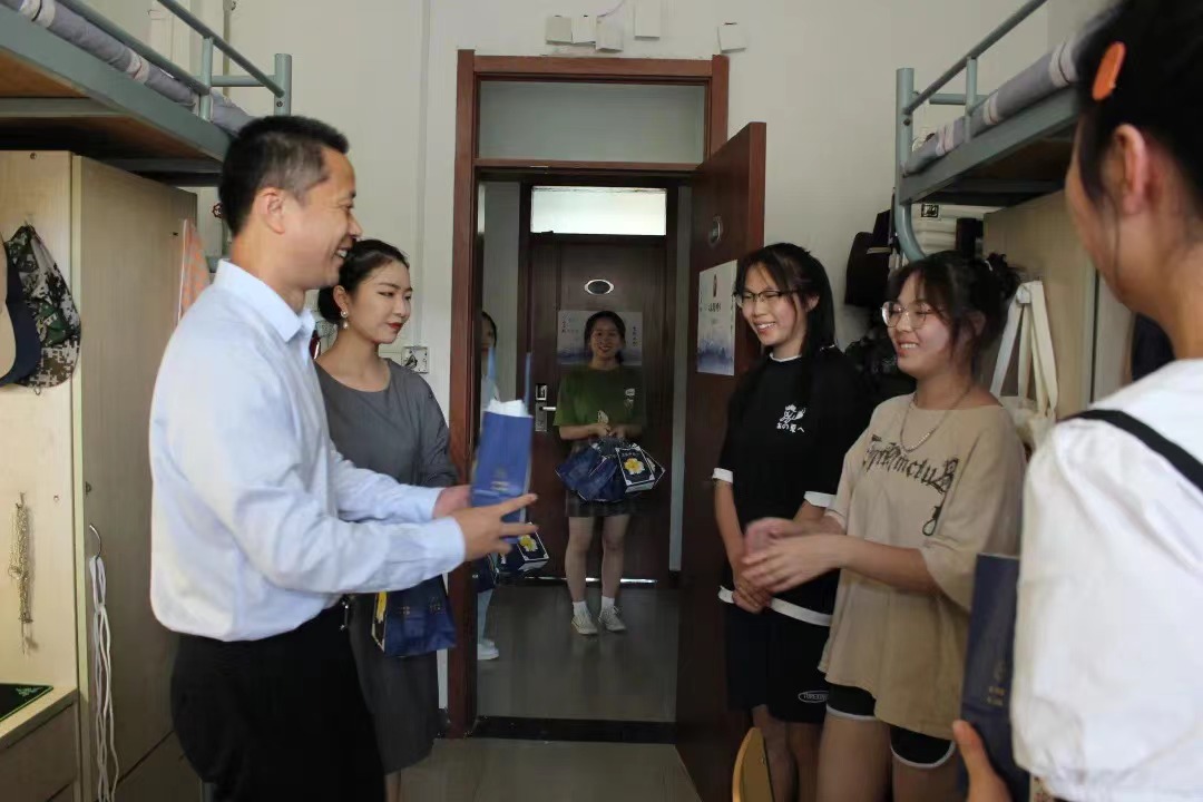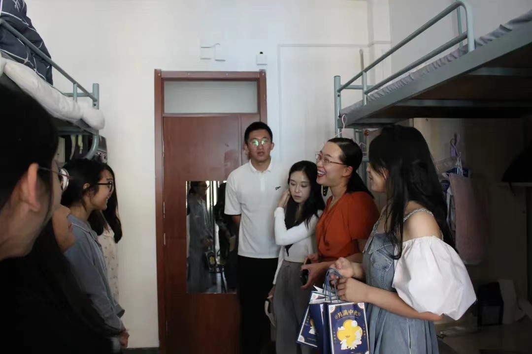 党委书记方跃平,院长史修永,副院长李广文、刘振,党委副书记刘宁,学工办主任李玉雪,新生辅导员张瑞亭、宋禹凝和新生班主任牛菡、姚佳慧等老师来到南湖校区学生宿舍看望本科新生,为同学们赠送中秋礼物,送上啪啪啦
