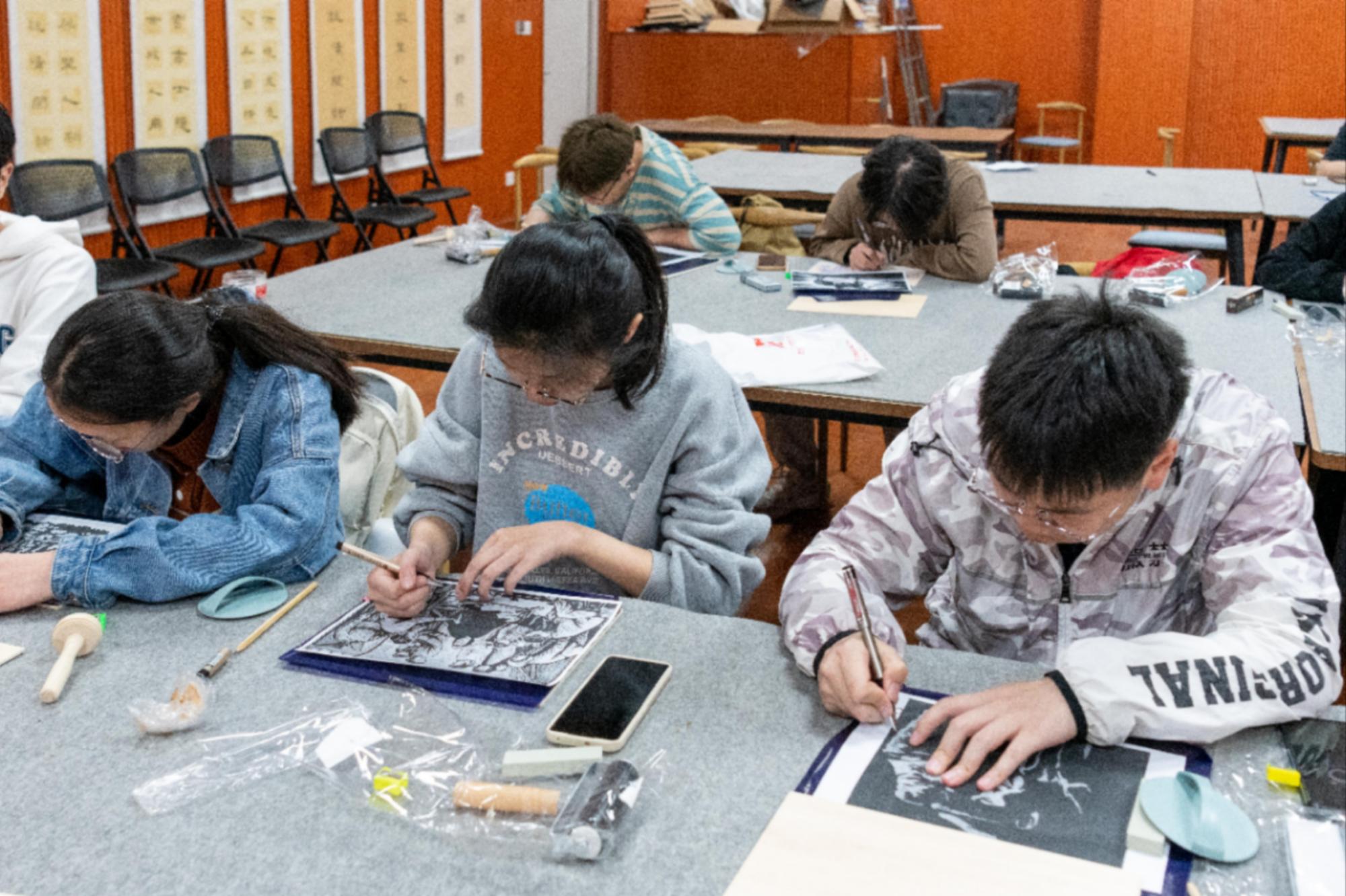 随后,王磊老师指导同学们进行实践体验。同学们在老师的指令下进行绘制、雕刻和拓印。同学们固定好木板和纸,把提前准备好的图案拓印在木板上,然后用刻刀进行刻制。在新鲜的体验中,同学们都全神贯注地雕刻着自己的作品。