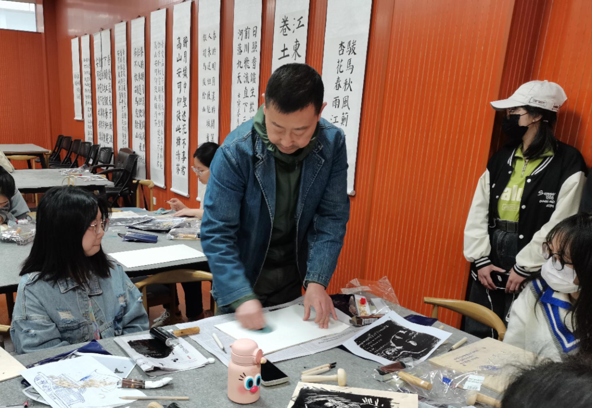 本期课程王磊老师首先带领同学们重温了上期木刻版画活动的相关内容,讲解了木刻版画深厚的文化底蕴及其在抗战期间发挥的巨大作用。