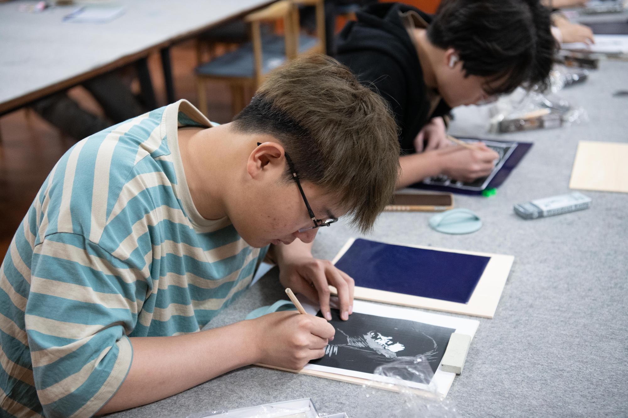 同学们专注雕刻木板