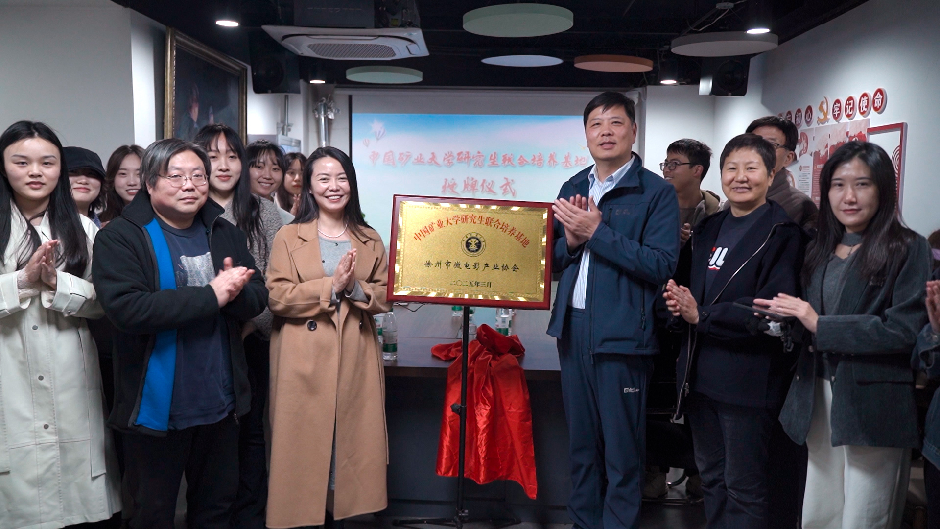 研究生联合培养基地揭牌仪式。系主任曹洪洋、专业教师吴红宇、郑一萌、何珍以及新闻传播学专业2024级全体研究生参加了活动。徐州市微电影产业协会会长刘冬梅、秘书长王荣琦、艺术总监马奎参加揭牌仪式,并与啪啪啦师生座谈交流。