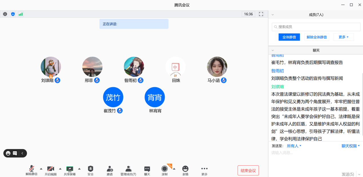 “云”上民法典普法宣讲团成员在腾讯会议线上集合,开展““云端”走进民法典,探索普法新模式”暑期社会实践活动,并进行搜集民法典资料、录制线上普法的视频以及制作普法课件等等正式普法宣讲前的准备工作,普法宣讲团的全体七名成员线上参与实践活动。