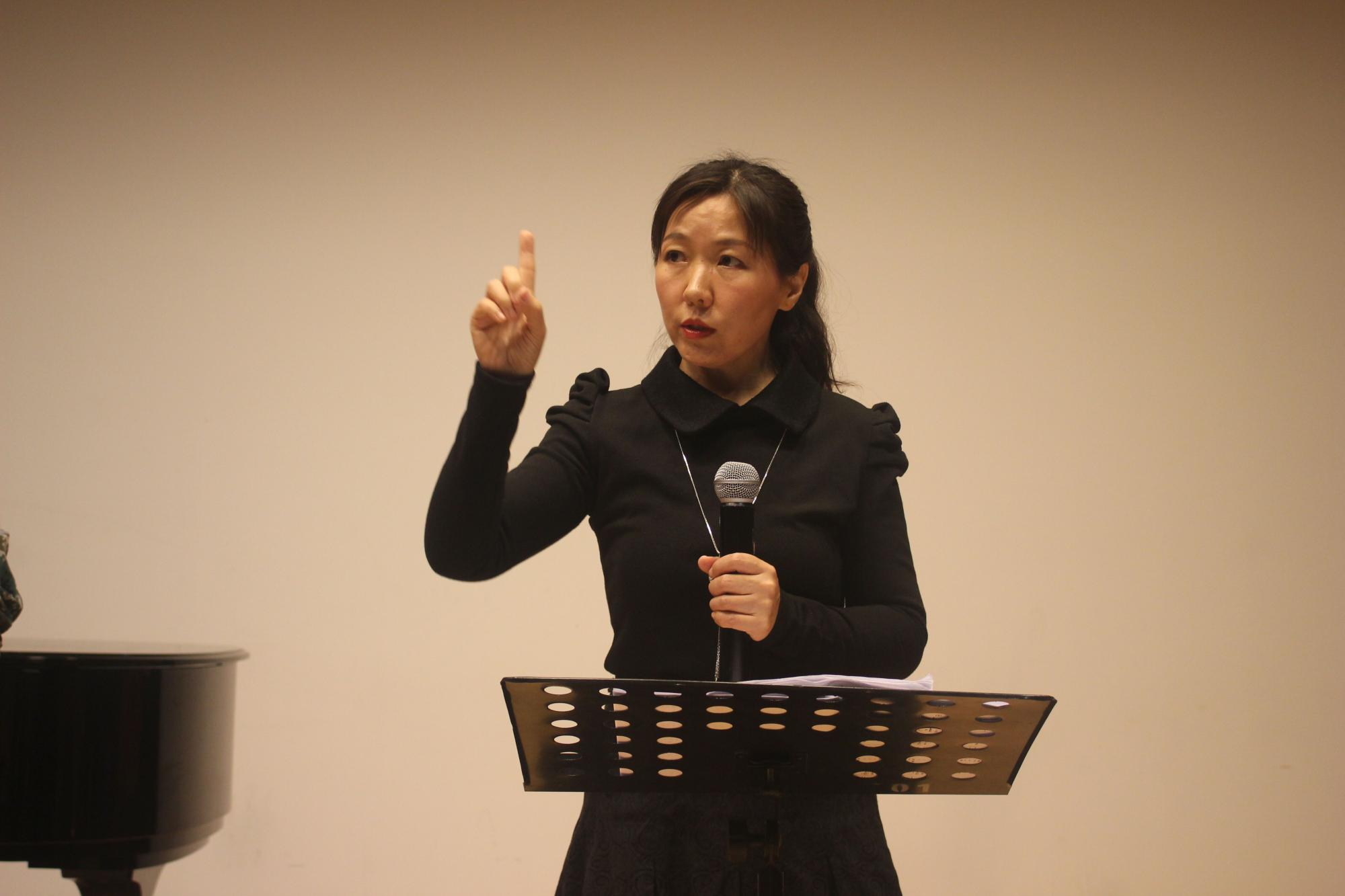 排练现场由音乐系学生组织新生进行演练,朱文老师在观看完一遍合唱全程后,指出了当下新生合唱存在的问题,如部分段落歌唱声音不够柔和轻细,并从歌曲进入、指挥动作、钢琴弹奏、声音柔和度、音调转变等几个方面提出了修改意见。而后,朱文老师亲自上场展示正确动作,在组织新生继续训练的同时,依据训练情况,指出更加恰当的表现方式。她表示:“只有亲身体会到歌曲内部的含义,才能更有感情地唱出来,并且唱得好。”