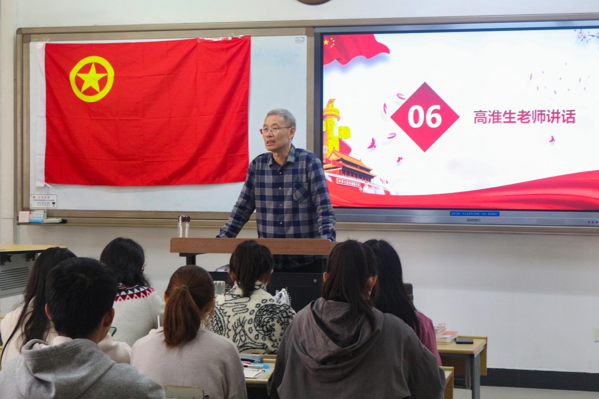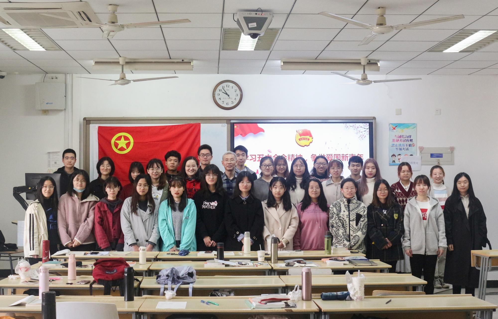 汉语言文学2019-1班团支部于博五C201举行“学习五中全会精神,争做爱国新青年”主题团日活动,团支部全体成员到场参与,团支书刘振乾组织本次活动。活动特别邀请曾从事过多年思政教育工作的中文系高淮生教授到场参与并发表讲话。