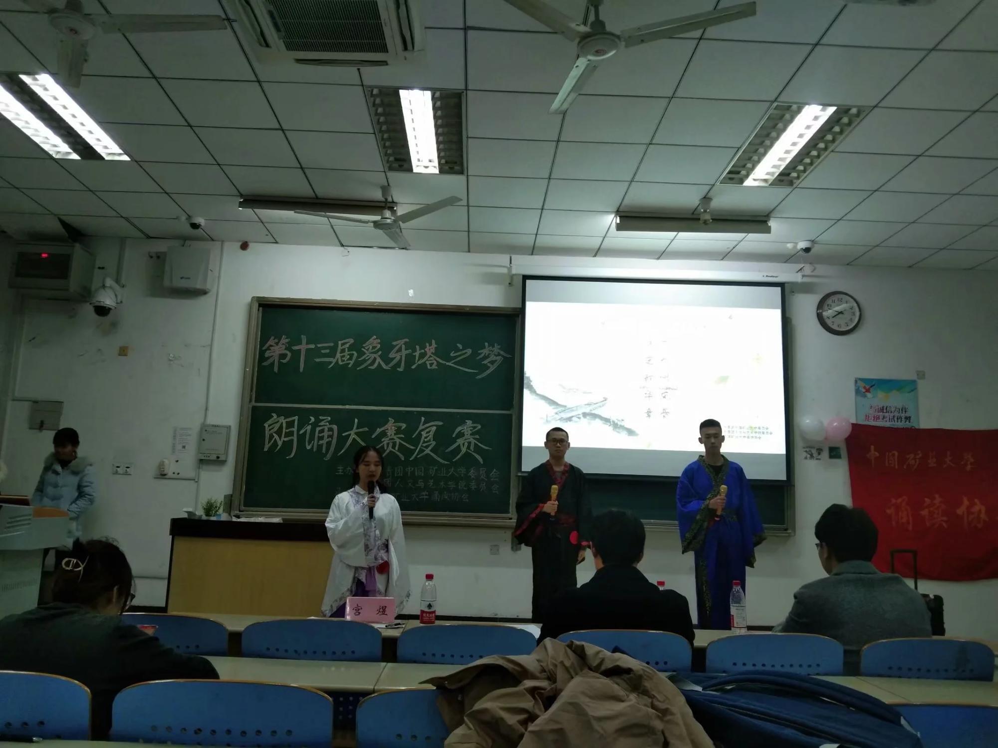 屋外是风刃寒霜,屋内是暖意融融。当晚7时整,比赛正式开始,挺进复赛的选手们各展身手。在这场比赛中,我们既听到了由张嘉昱、王浩宇、王净三位同学带来的《海棠依旧》,又耳闻了刘辛梅、谌金娟、徐誉铭、陈雨杭四位同学的《献礼中国》,在那《可曾记得,你的祖先名叫炎黄》里,看到一帧帧黄皮肤黑眼睛的民族撑起来的骄傲映像。还有《乌骓别霸王》,为我们展现了项羽悲壮的结局。那《荀彧之死》又给评委和同学们带来对荀彧形象的解读。比赛的最后,评委们对选手们的表演表示赞扬,同时给予了鼓励。