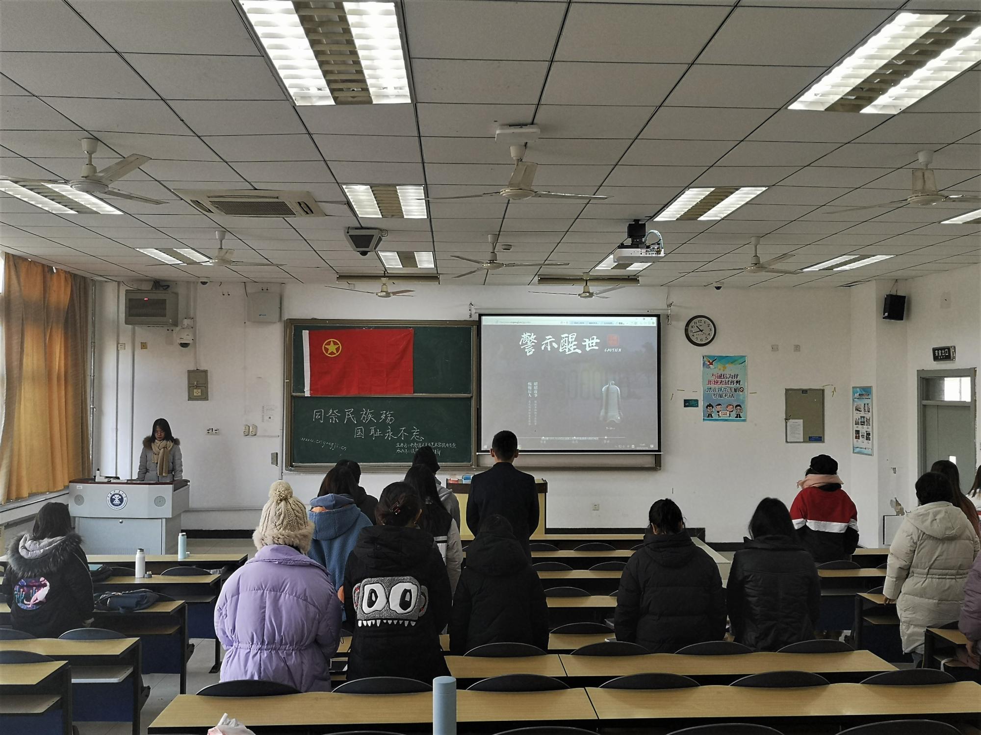 在团日活动的最后,同学们纷纷在纸上写下了对遇难同胞的祈愿,同时也在团支书的指导下登陆了国家公祭日网,线上送出了自己的一份心意。在沉重的钟声里,全体同学默哀一分钟,缅怀南京大屠杀死难同胞,全场庄严肃穆,气氛凝重。接着,团支书刘潇潇简单总结了活动内容,并呼吁大家应铭记历史,不忘国耻,本次团日活动顺利结束。
