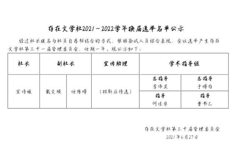 经过社长提名与社员自荐相结合的方式,根据面试人员综合表现,会议选举宣诗媛为存在文学社第31届社长,任期一年;选举戴文硕、任陈博为存在文学社副社长,任期一年;改选学术指导组部分成员。会议还宣读了2020~2021年度表彰决定,并在大会结束后,由存在文学社第三十、三十一届管理委员会全体成员共同合影留念并举行换届聚餐。