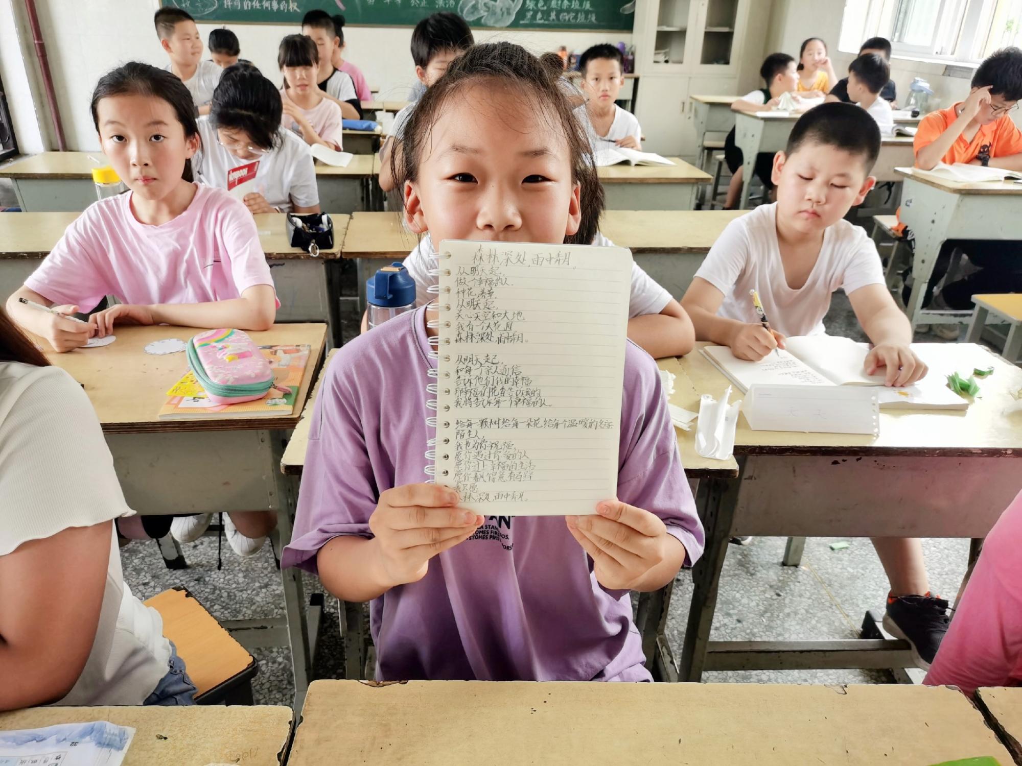 第一节课,万笑颜对同学们进行了疫情防控、校园暴力、防水防电三方面的安全教育,辅之以视频放映、情景剧演出等形式,充实了讲授内容,同学们还于课堂中掌握了“七步洗手法”、“口罩摘、戴方法”。第二节课是朱宣颖、万笑颜共同进行授课的“外国文学”。本课主要针对《罗密欧与朱丽叶》和《凯撒大帝》进行赏析,朱宣颖进行了相关创作背景和内容的介绍后,给孩子们放映了相关动画影片,并由万笑颜在放映结束后进行内容与主旨方面的提问。下午开启的第三节课是孟宇的“声声入耳”,课程的主要内容为放映舞台音乐剧《冰雪奇缘》。孩子们在嘹亮动听的歌声中感悟到音乐的魅力与生命不可磨灭的张力,该节课进一步激发了孩子们对音乐的热情。第四节课为课业辅导,朱宣颖和万笑颜针对孩子们暑期作业中存在的问题给予详细的解答。此外,孩子们还丰富了前一天所绘的画扇,并根据海子的《面朝大海,春暖花开》进行了二次创作,每一位幼小的心灵都在尽情表达对幸福与爱的追求。