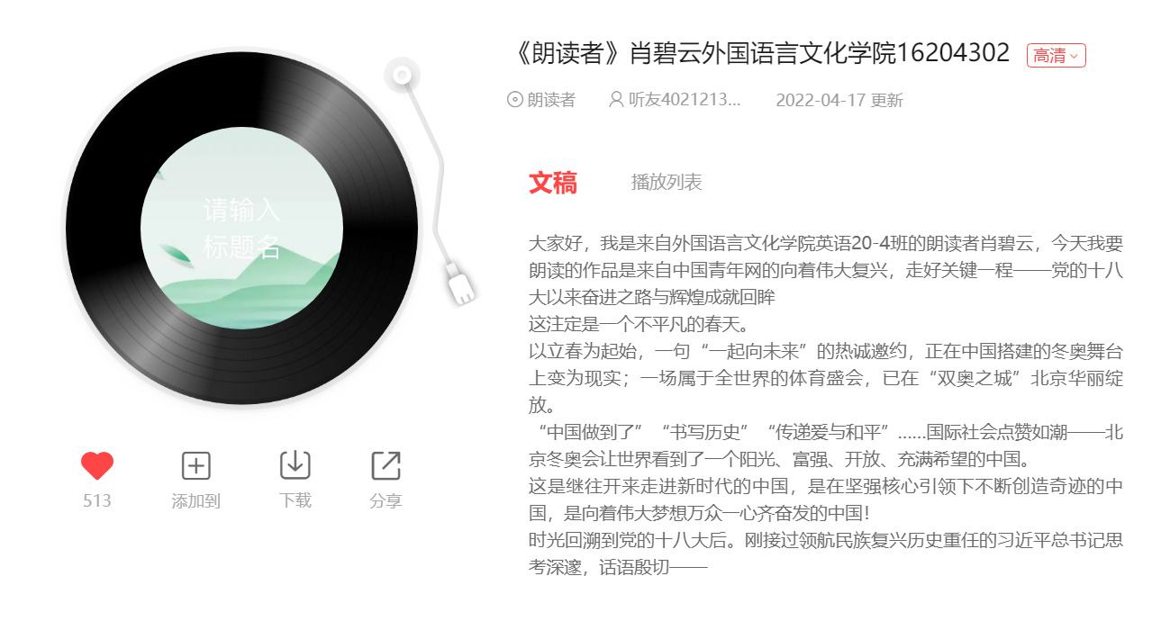 的肖碧云同学获得了本次比赛的一等奖。她朗读的是发布于中国青年网的《向着伟大复兴,走好关键一程——党的十八大以来奋进之路与辉煌成就回眸》一文。“以立春为起始,一句‘一起向未来’的热诚邀约,正在中国搭建的冬奥舞台变为现实;一场属于全世界的体育盛会,已在‘双奥之城北京华丽绽放。”该文从中国北京承办的2022年冬奥会讲起,回溯了我国党的十八大以来在政治、经济、生态等方面取得的巨大成就。肖碧云同学用真挚的字句演绎了党的奋进之路,描摹了一个阳光、富强、开放、充满希望的中国。