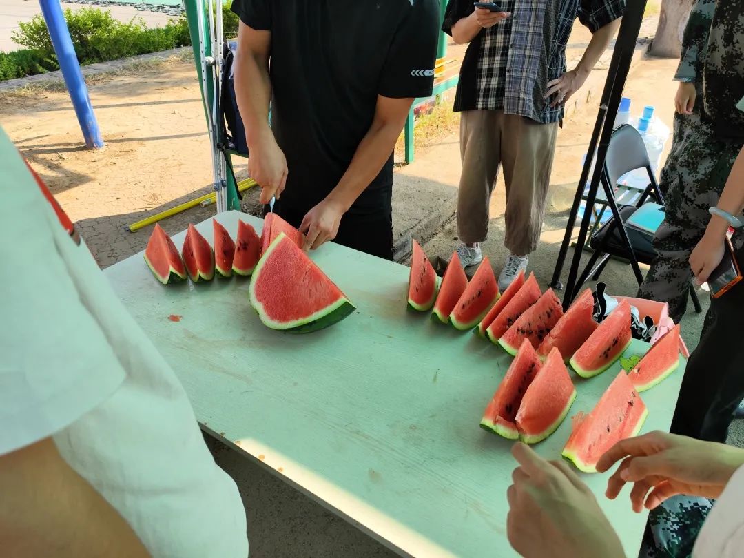 组织学长学姐为同学们准备西瓜和饮料解暑,颇具人文关怀气息。酸痛的肌肉与纵横的汗水似乎都不见了身影,汽水的甘爽酣畅淋漓地放松了同学们的身心。此刻,经历汗水与艰辛后的愉快笑容在同学们的脸上是如此明艳!