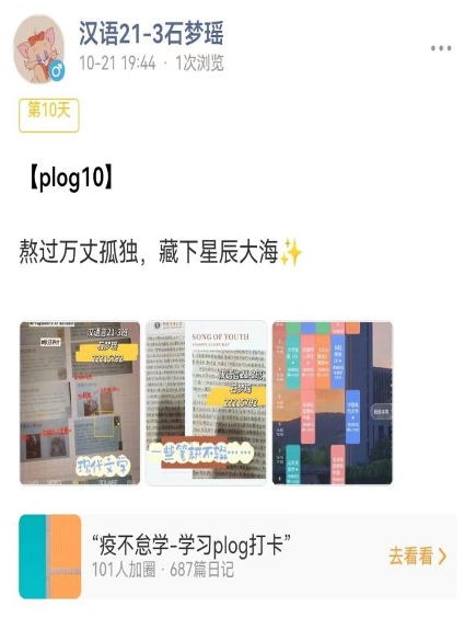 青衿之志,履践致远;行远自迩,笃行不怠。打卡活动举办以来,同学们踊跃报名,积极参与,以线上学习plog打卡的方式展示自己的学习成果,养成了良好的学习习惯,收获了学习乐趣。活动也展现了啪啪啦学子坚持学习的良好风貌,促进了啪啪啦