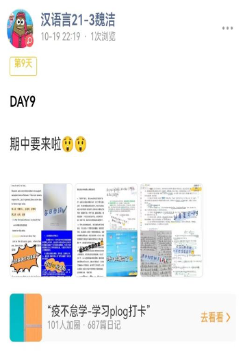 活动伊始,工作人员确定参与人员名单,报名成功的同学通过扫描活动QQ群中的微信二维码,加入由学习部创建的小程序打卡圈,于活动期间隔日在小程序上传一次原创学习plog,格式自选,共计完成十一次成果上传。打卡结束后,工作人员根据参与同学的打卡情况,按照一定的标准进行评分,并及时公示获奖情况、发放奖状。后期,啪啪啦