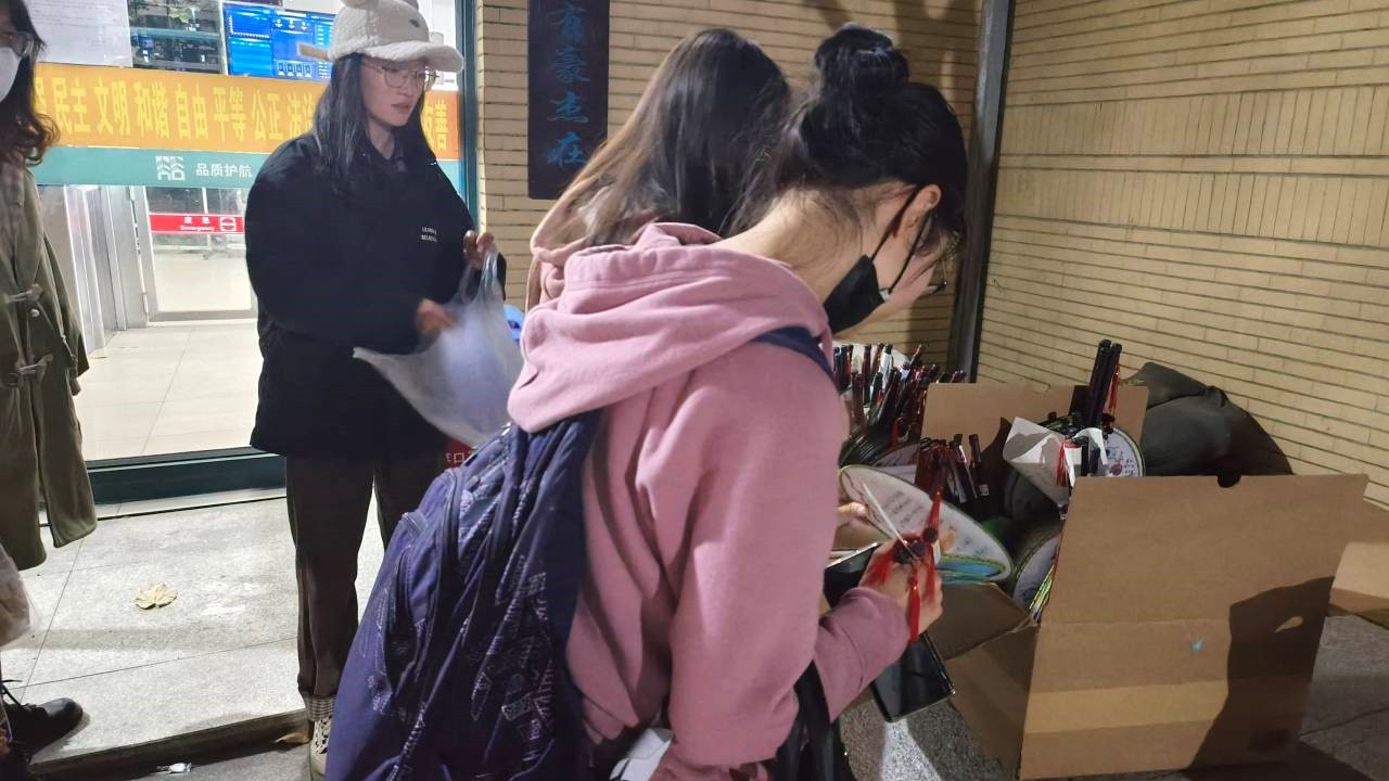 的志愿者们在竹三楼下交换画扇,分享彼此对矿大美景的见解。一幅幅精美画扇,传递着志愿者们对美的生动体悟与无限遐想,打开了校园中互不相识之人的话匣子。后期,工作人员还会将剩余的画扇送给苏电社区的小朋友,带他们一同在诗情画意中欣赏矿大风光。