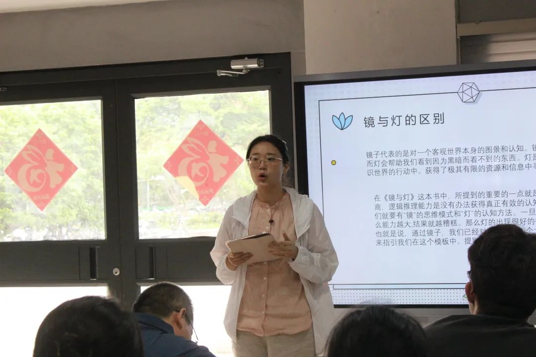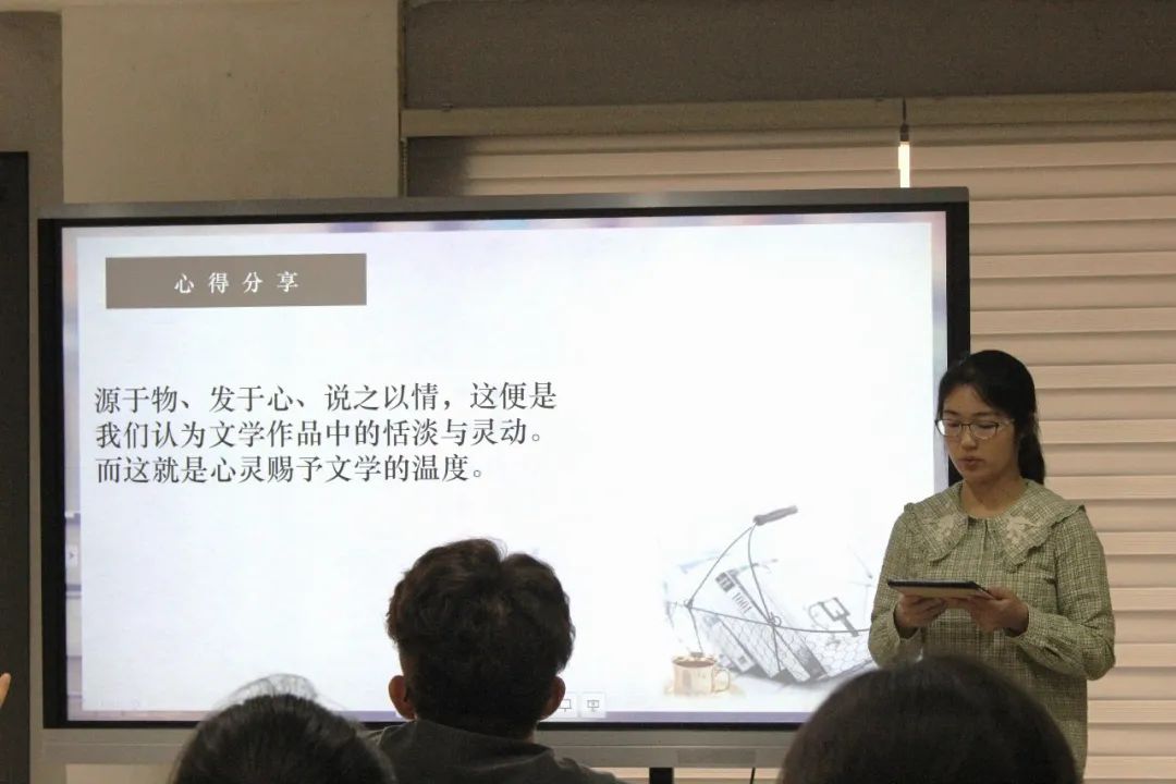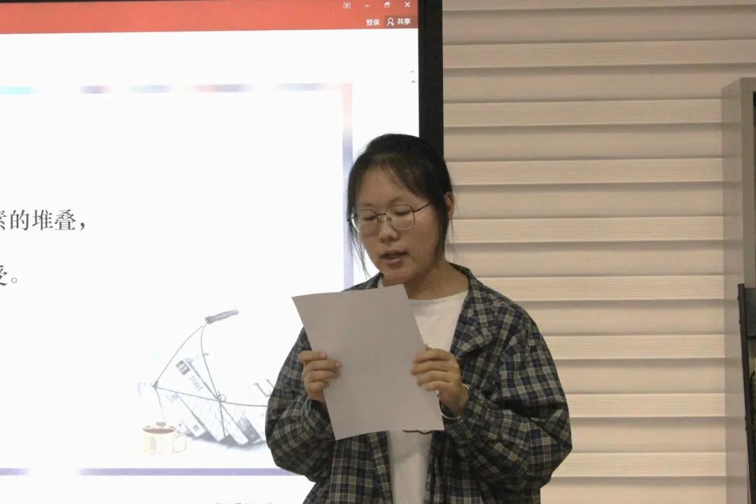 本次读书会采取分组研究的方法,六个小组分别展示了选题研究与阅读感受。第一组同学侧重阅读导论部分,分析介绍实用说、模仿说、表现说和客观说;第二组同学分享他们对表现说与中国传统诗论“诗言志”的区别的研究与看法;第三组同学结合阅读同类书籍《谈美书简》和《美的历程》的心得阐述对本书的理解;第四组同学分别分享自己将文艺理论扩展到学习生活中的阅读感悟;第五组同学通过例举研究《致云雀》《西风颂》和《孟东浦津关河亭作》等诗歌,并在中西对比中,阐释表现说在具体诗歌中的体现;第六组同学展示了他们对中西方模仿说的联系与差异的研究。分享过程中,同学们积极提出问题、表达疑惑,陈长利老师热情回答了同学们的提问。