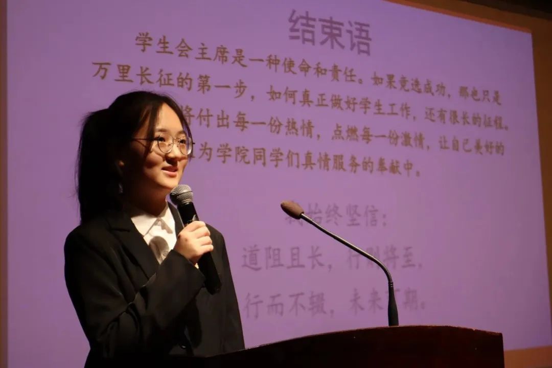 会上,第四届学生会主席团成员候选人作竞职演讲。葛俊青、刘志贤、秦越蕾、王姣蕊、杨梓美慧就个人简历、工作经验、自身优势和工作展望等方面依次进行现场陈述,并回答了学生代表和老师提出的问题。所有候选人展示完毕后,参会学生代表和老师依次上场进行投票。大会总监票人范丽洁宣布了本次大会选举结果。