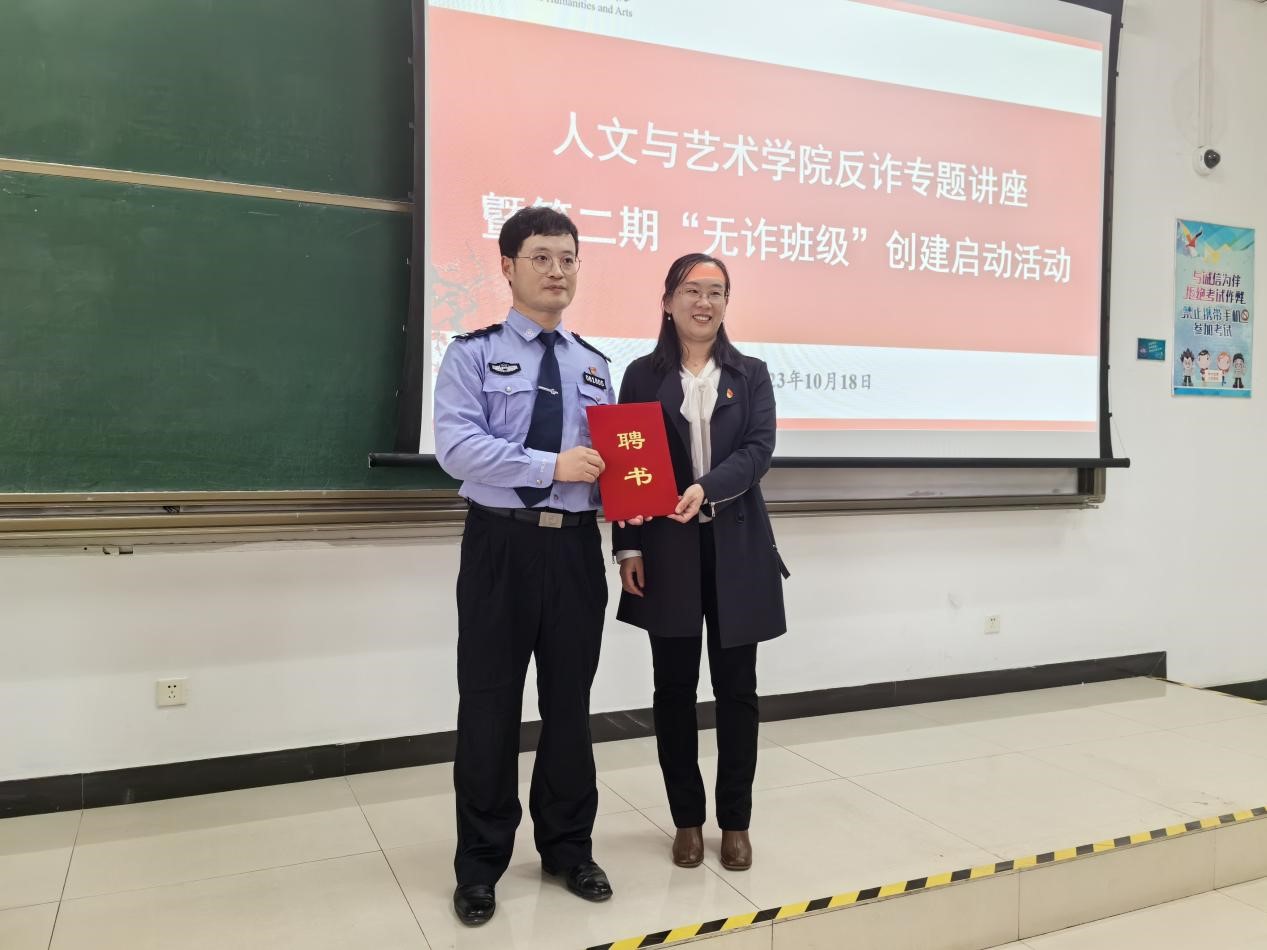 刘宁副书记向祁中誉副所长颁发“校外辅导员”聘书,为获得第一期优秀“无诈班级”的法学21-3班和汉语22-4班颁发奖状。苏辉老师介绍了啪啪啦