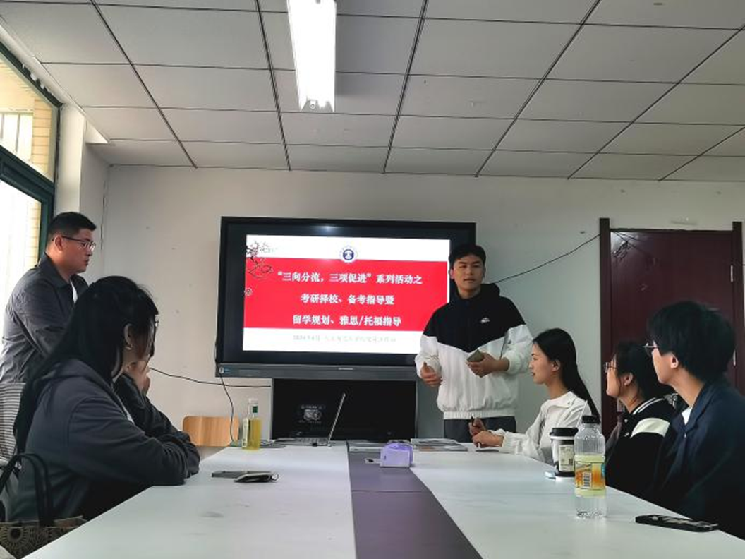 党员工作站在竹三A207举办“三向分流,三项促进”系列活动之考研备考指导暨留学规划交流会。新东方国际教育留学运营负责人孔舒主持活动,2021级兼职辅导员王娇和20余名学生参加了此次指导会。
