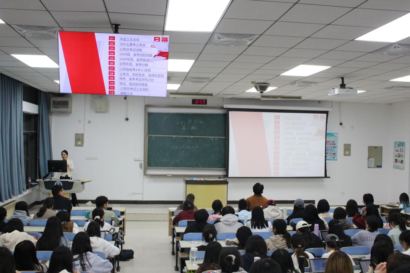 侯一珂从参考原因、考试流程、备考方案等方面展开对考公流程的介绍,指出意愿、技巧、氛围、练习上岸四大要素,同时列举优秀学长学姐的案例以激励有意愿考公的学子认真备考,并提出相应的时间规划建议。