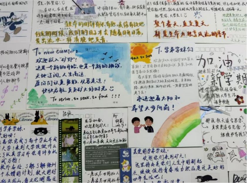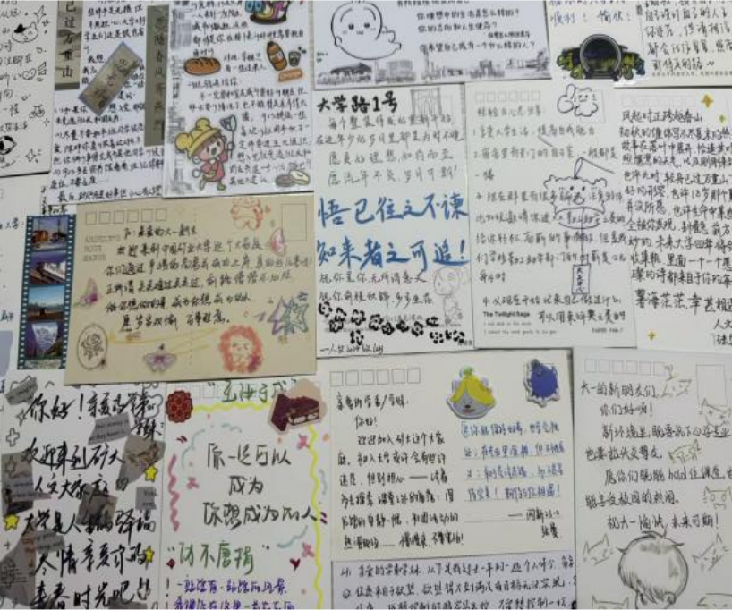 本次活动以明信片为载体,鼓励同学们为2025级新生撰写祝福,体现了新颖独特的创意与昂扬的精神风采。活动期间,同学们积极参与创作。作品完成后,工作人员统一收集,根据作品绘制情况进行整理与判定,最后公示结果,并将所有作品发放给2025级新生。同学们的作品或以文传情,或以画写意,传递了学长学姐温暖的关怀。
