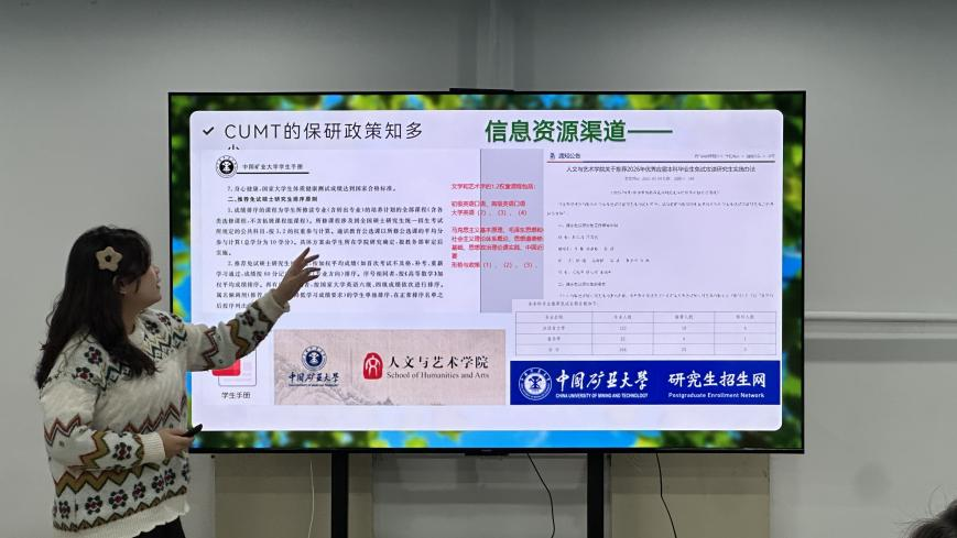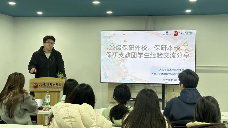 在分享环节中,沙语瑄(保研至厦门大学语言学及应用语言学专业)围绕简历准备、复习准备和面试准备三个方面作经验分享,她从如何制作一份亮眼的简历到专业课复习技巧,再到面试时的应答流程,为同学们详细梳理了保研时间线以及前期准备要求,同时提出英语学习的重要性,鼓励同学们在英语学习方面多下功夫。邓雅文(保研至本校中国语言文学专业)带领现场同学仔细阅读了保研细则,以幽默的语言讲述了自身的保研经历,着重介绍了本校的推免流程和面试过程,展示了自己从“保研边缘人”到保研成功的心路历程,给很多处在保研边缘的同学们打了“强心剂”。袁嘉晟(通过支教团保研至本校中国语言文学专业)主要从研究生支教团的选拔政策进行分析,他说,支教团保研需要积累丰富的学生工作经历,他建议有意愿的同学从现在起就要在加强理论学习的同时,多进行社会实践、多参加活动、担任学生干部,丰富自己的学生工作履历。同时,他还分享了正在进行的研究生支教团培训,给同学们全方位展示了支教团保研的发展路径。唐婉怡(保研至深圳大学艺术学专业)从选择保研院校谈起,着重给同学们讲述了如何选择适合自己的学校以及如何提升面试水平,她提出,可以运用AI工具进行自我面试培训,通过保研通、小红书等应用软件找到相关院校的考试资料进行学习,事半功倍。