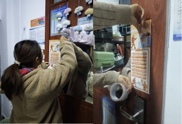 学生会生活部精心设计制作了宣传海报,普及消防安全知识,包括宿舍常见火灾隐患、灭火器使用方法及逃生自救要点等。其中,大海报张贴于竹一楼学生活动室宣传栏,并印制多份小海报,由各班安全委员分发至每间本科生宿舍,确保消防安全提示覆盖到每一位同学。同时,啪啪啦