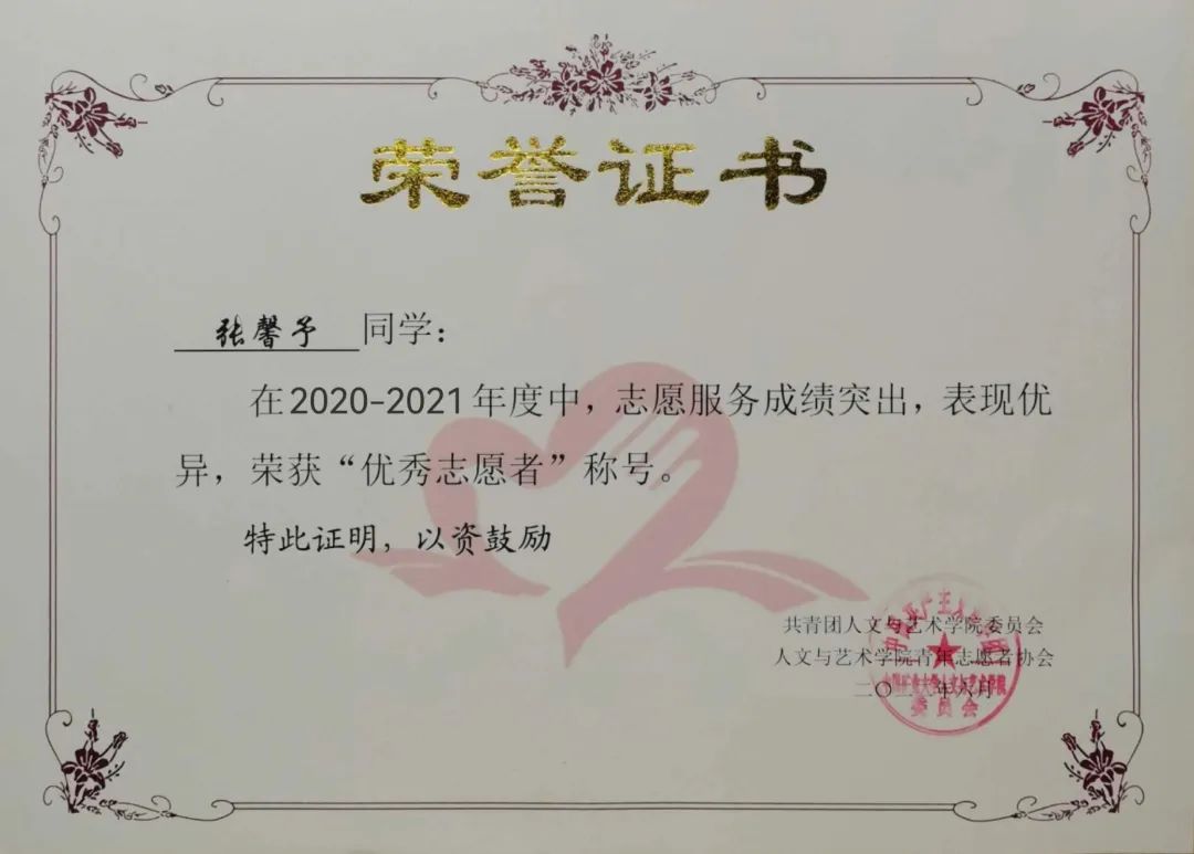 的三年,她用志愿活动充实自我,在领悟志愿服务真谛的同时收获着个人成长。虽然常与辛苦和挫折相伴,但赠人玫瑰的清香常存,鼓励她不断前行。