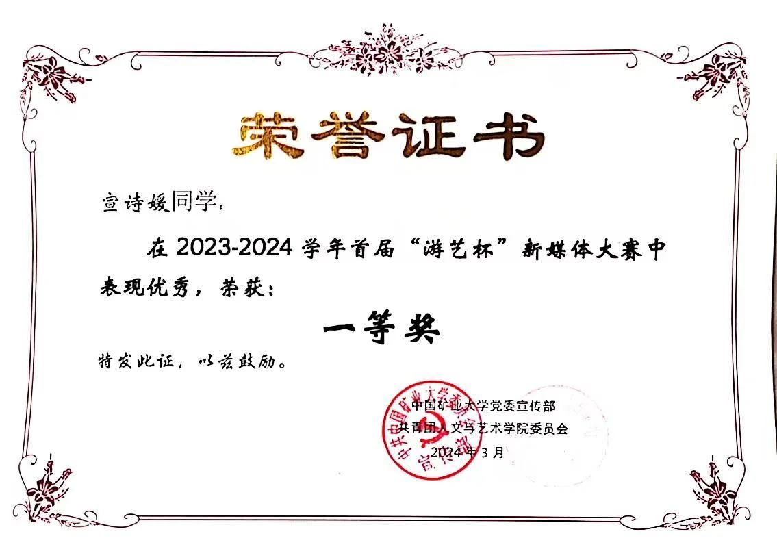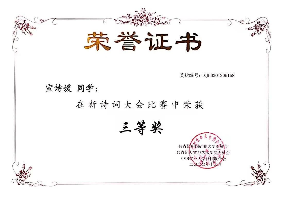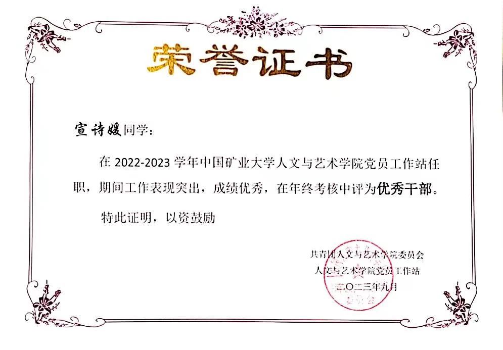 本科生活期间,宣诗媛积极投身学生工作,并因此受益匪浅,逐渐成为一个独立自主的人,于悄无声息间树立起一份责任感。她曾是我校校园原创剧目《石炭歌者苏徐州》的编写者之一,对此她谈到“在写作的过程中,最大的惊喜便是苏轼的形象在我的认识中逐渐立体生动起来,不再只是出现在课本诗词中的那个模糊的苏轼了。他是一位伟大的文人,还同时担任着着臣子、父母官、政治家、父亲、丈夫等等多重角色;他不仅关注青山绿水、纵情诗酒年华,也十分在意百姓生活、慨叹民生之艰……同时我发现,很多人对苏轼和徐州的关系并没有太多的了解,这是很可惜的一点,所以也想借这个舞台剧让大家看到苏轼作为大文豪的另外一面,了解苏轼作为徐州的文化符号还有更多值得发掘的地方。”在她看来,很多时候自己的工作都是将理性的决断和感性的审美理想相结合并付诸于实践的一个过程,从中不仅能得到有效的锻炼,还收获了前所未有的满足感和成就感。“社团工作也是一种学生工作,也需要对校团委和院团委负责,作为一个组织的负责人,我身上更多的是责任而不是荣誉。人往往会在拥有更大选择权的时候失去选择,所以我特别注意紧密联系指导老师和指导单位,在充分考察社员的意愿后发起活动,带动大家做有意义的事情。”她在采访中说道。