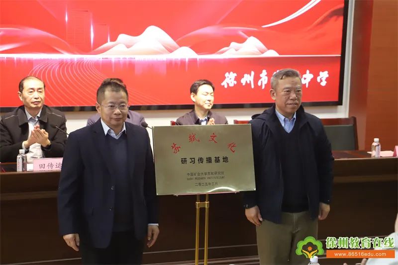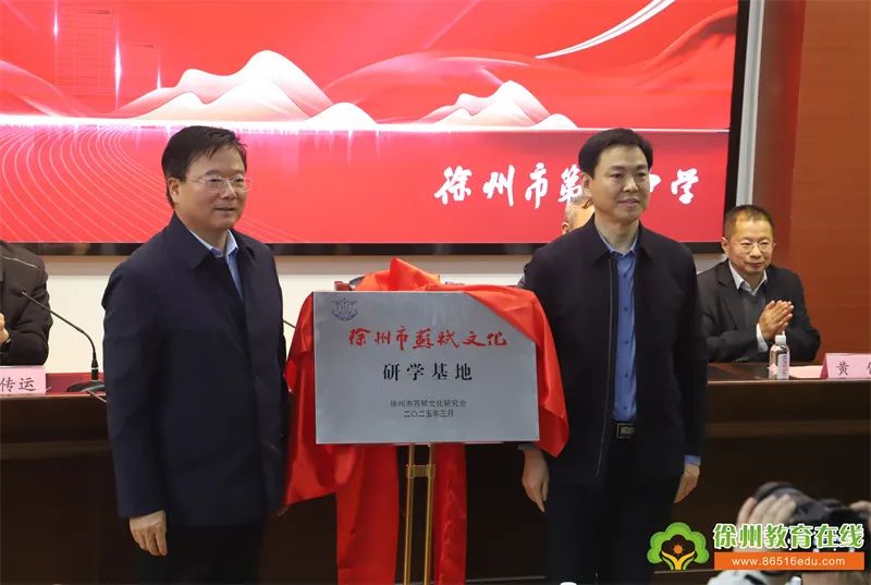 在热烈的掌声中,学校领导和嘉宾共同为基地揭牌。管仁福院长、黄俊校长为“苏轼文化研习传播基地”揭牌,陈新生会长、张传暴副局长为“徐州市苏轼文化研学基地”揭牌。红绸飘落,金色、银色的牌匾熠熠生辉,现场气氛达到了高潮。