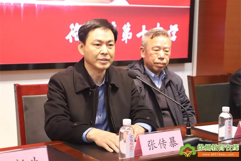 徐州市教育局党委委员、副局长张传暴讲话。首先,他代表徐州市教育局,向徐州十中表示热烈的祝贺!向长期以来关心和支持徐州教育事业发展的社会各界致以崇高的敬意和衷心的感谢!他指出,我们通过“苏轼文化进校园”活动,将这份宝贵的文化遗产融入学校教育,不仅是对中华优秀传统文化的传承,更是对青少年文化自信的培养。近年来,徐州十中不仅教育教学质量突飞猛进,在推进苏轼文化进校园方面也做出了卓有成效的努力。学校通过组织研学活动、举办诗词创作比赛、打造文化长廊等形式,让苏轼文化深入校园、走进课堂、融入生活。今天的揭牌仪式,标志着徐州十中在文化育人方面迈出了新的步伐,也为全市中小学树立了榜样。希望徐州十中深化文化育人、创新教育形式、加强校际合作。以苏轼文化为载体,通过诗词朗诵、专家讲座、研学实践等形式,加强与市内外学校、文化机构的携手,让苏轼文化更加生动鲜活地走进学生心中,培养学生的家国情怀和文化自信,打造徐州文化教育的亮丽名片。今天是三月十二号植树节,苏轼文化就像一棵树,今天栽下去,师生们要精心呵护培育,努力使她枝繁叶茂,茁壮成长。希望徐州十中以此次揭牌仪式为契机,继续谱写文化育人的新篇章!